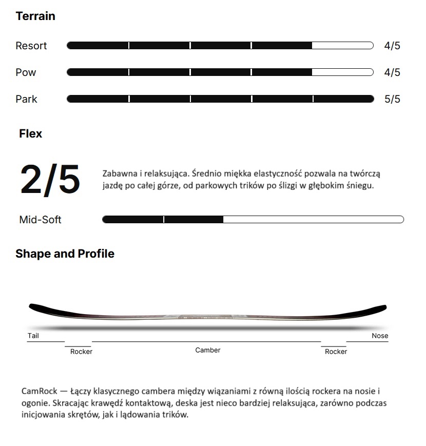 Sensor to deska dostosowana do parkowych ridingów, wyposażona w wiele technologii, aby zapewnić dobrą zabawę wszędzie na stoku. Jej symetryczny kształt typu true twin jest idealny do startów i lądowań switch, ale zachowaliśmy wystarczająco dużo wolumenu w nosie i ogonie, aby dobrze unosiła się w śniegu, jeśli chcesz zaszaleć w głębokim śniegu. Profil CamRock oraz tipy SideKick, które podnoszą krawędzie, zachęcają do progresji – płaskie butter, jazda po railach i spinny to ulubione miejsca tej deski.