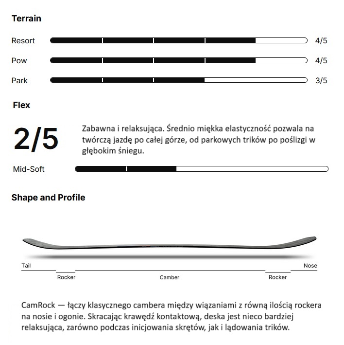 - CamRock łączy klasycznego cambera między wiązaniami z rockerem na nosie i ogonie. Skracając krawędź kontaktową, deska jest trochę bardziej relaksująca — zarówno podczas inicjowania skrętów, jak i lądowania trików.