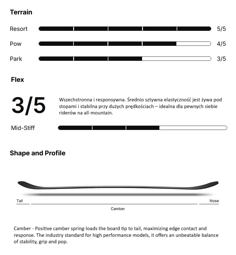 - Pełny profil camber sprężynuje deskę od nosa do taila, co pomaga utrzymać kontakt z śniegiem na całej długości krawędzi i zwiększa reakcję.