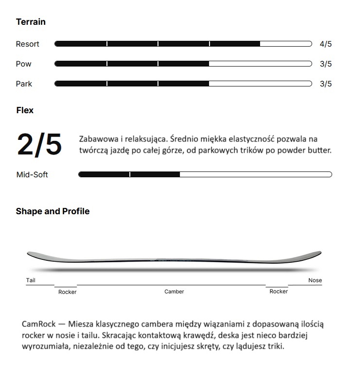 - Luźny flex od nosa do taila jest zrównoważony przez trójosiowe włókno szklane, które sprawia, że deska jest responsywna na krawędziach i stabilna przy dużych prędkościach.