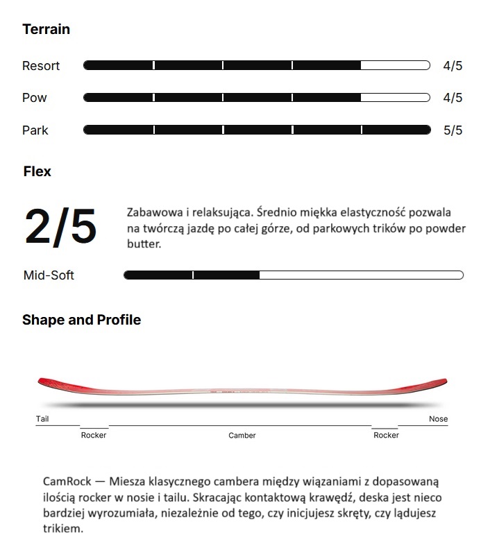 Sensor to deska przeznaczona głównie do parku, wyposażona w najnowsze technologie, które zapewniają świetną zabawę na całej stoku. Jej symetryczny kształt typu true twin jest idealny do startów i lądowań switch, ale jednocześnie zachowuje wystarczającą ilość objętości w nosie i tailu, aby dobrze unosiła się na puchu, jeśli chcesz się zaszaleć w głębokim śniegu. Profil CamRock i Tips SideKick podnoszą krawędzie, co sprzyja progresji – flat land butter, linie na railach i obroty z wypełnieniem są tym, w czym ta deska czuje się najlepiej.