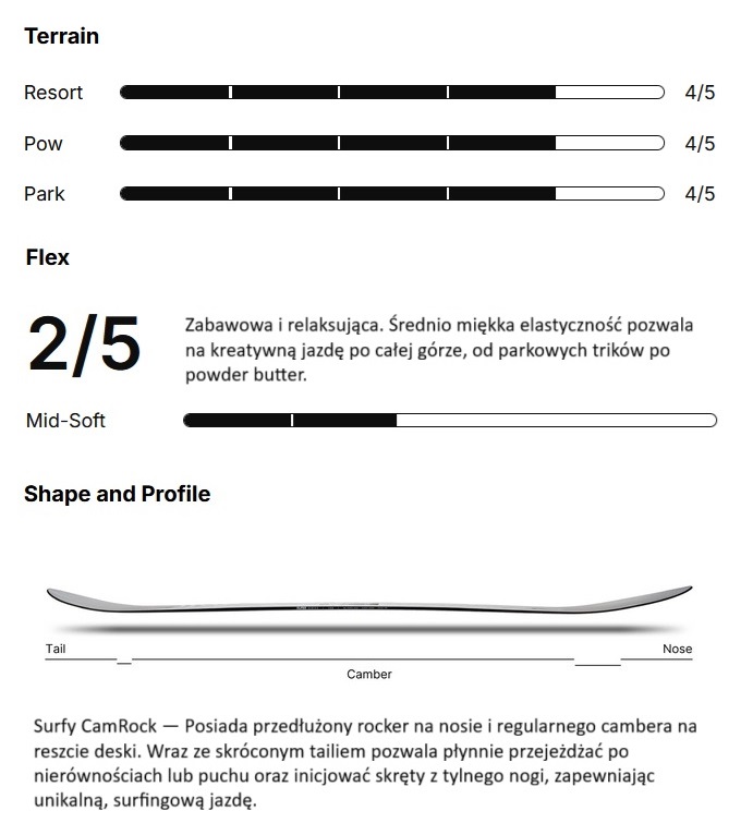 - Nasz profil Surfy CamRock jest sprężynowo naciągnięty między stopami, a rozszerzony rocker na nosie pomaga Alpha płynnie przejeżdżać po nierównościach i głęboki śnieg z łatwością.