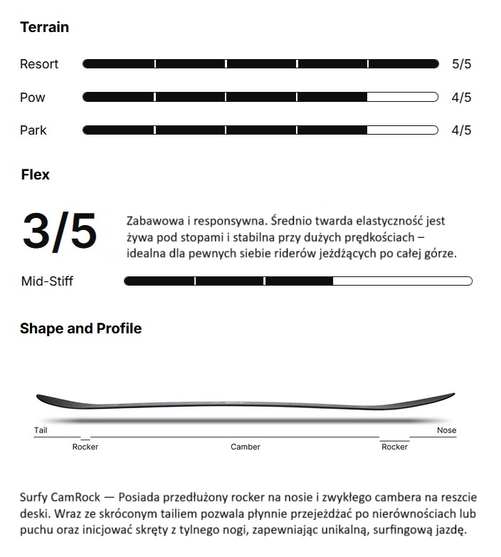 - Nasz profil Surfy CamRock jest sprężynowo naciągnięty między stopami, a rozszerzony rocker na nosie pomaga Alpha APX ciąć przez nierówności i z łatwością plować głęboki śnieg.