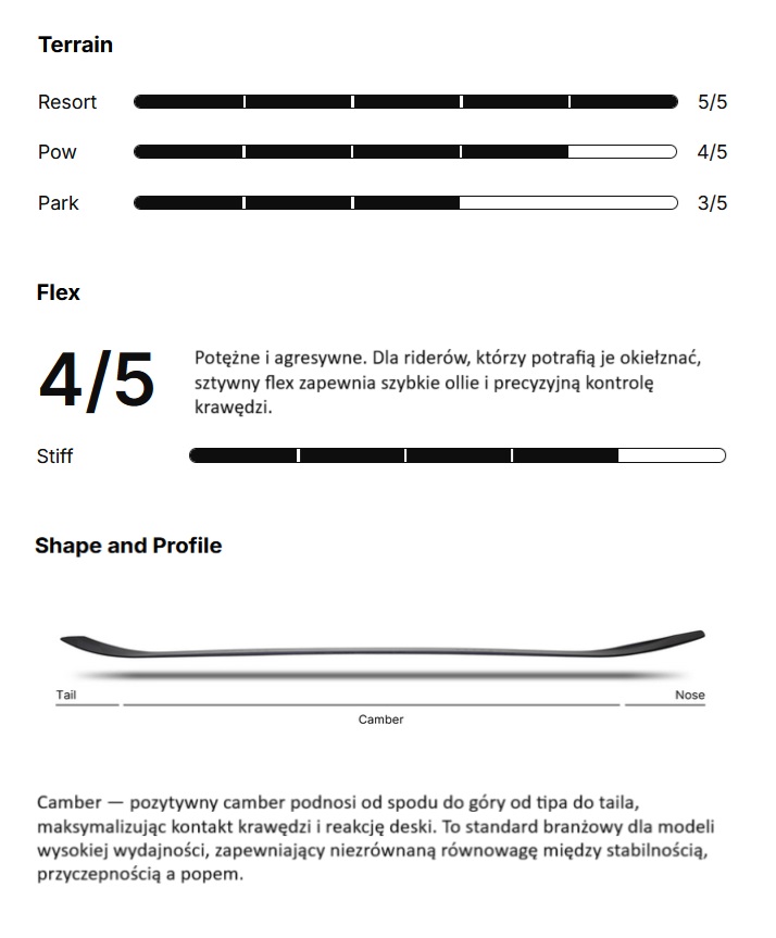 - Pełny camber spring-ładunkowo napędza deskę od nosa do ogona, pomagając utrzymać kontakt krawędzi ze śniegiem i zwiększając reaktywność.