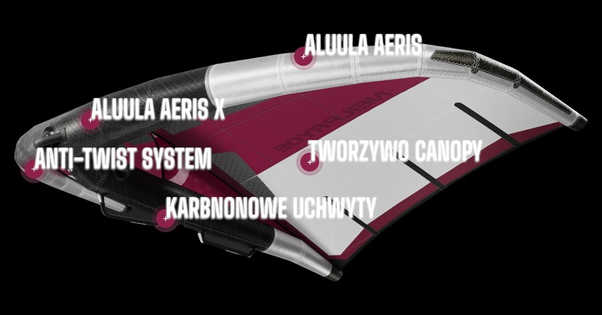 LE z materiałami ALUULA AERIS X zapewniającymi wytrzymałość i trwałość oraz ALUULA AERIS zapewniającymi trwałe i ultralekkie końcówki skrzydeł.